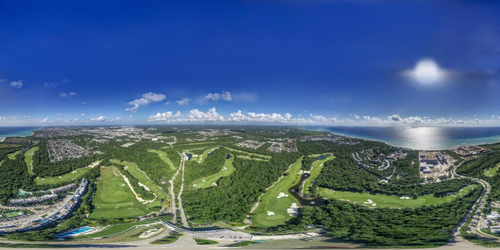 Pano Drone 360º aéreo para campos de golf en un sitio web es la mejor manera de mostrar a tus clientes todo el panorama del campo de golf.